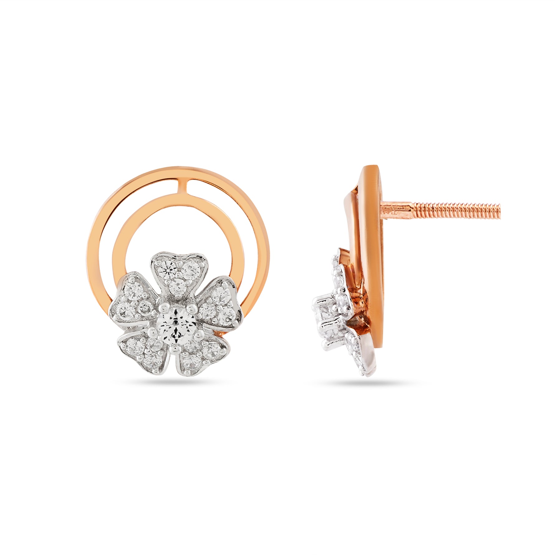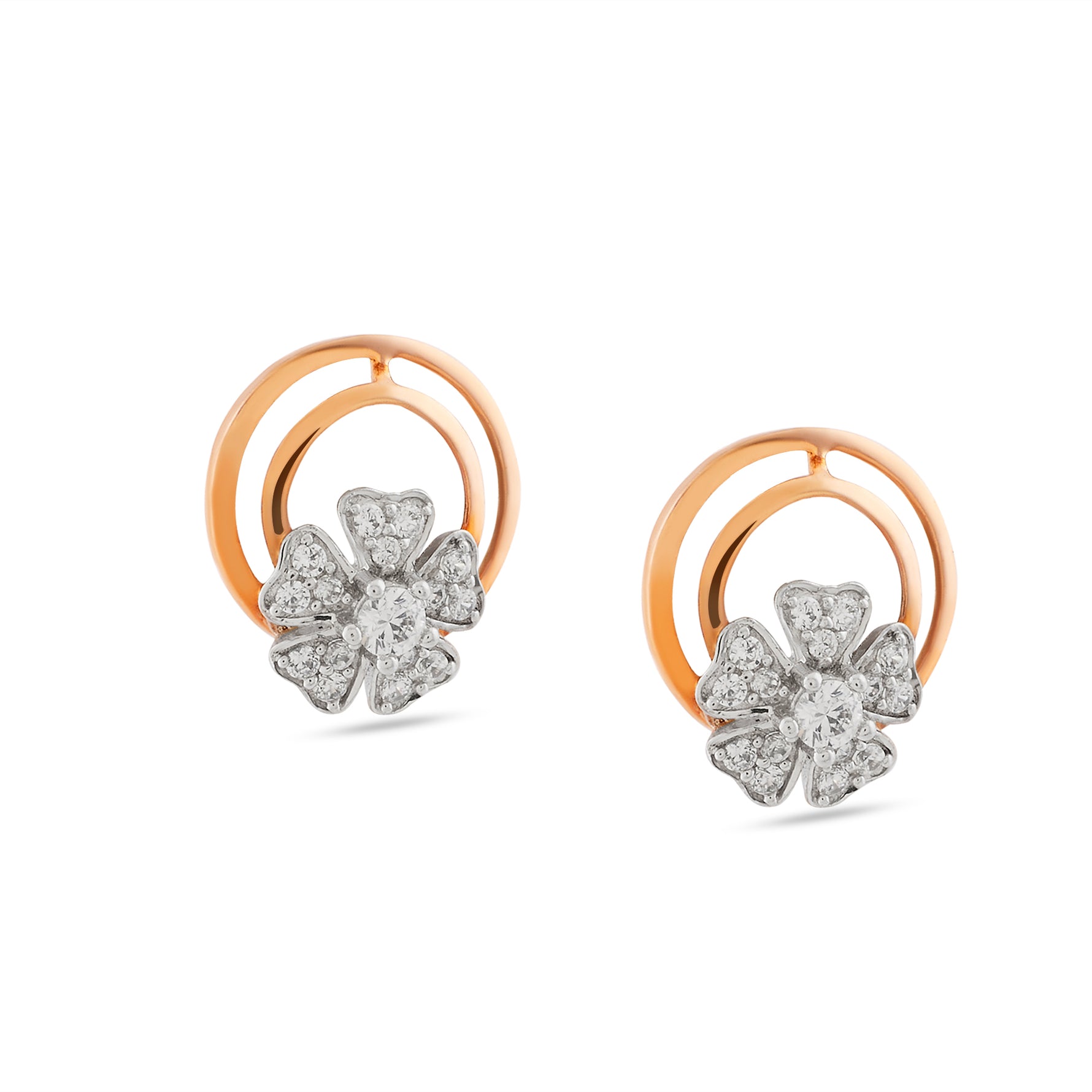 Exude timeless charm with these captivating stud earrings, featuring a brilliant five-petal floral motif nestled within a sleek double-circular frame. The intricate design blends modern geometric lines with delicate botanical inspiration, creating a versatile accessory that brings a touch of sophisticated radiance to both professional attire and evening ensembles.