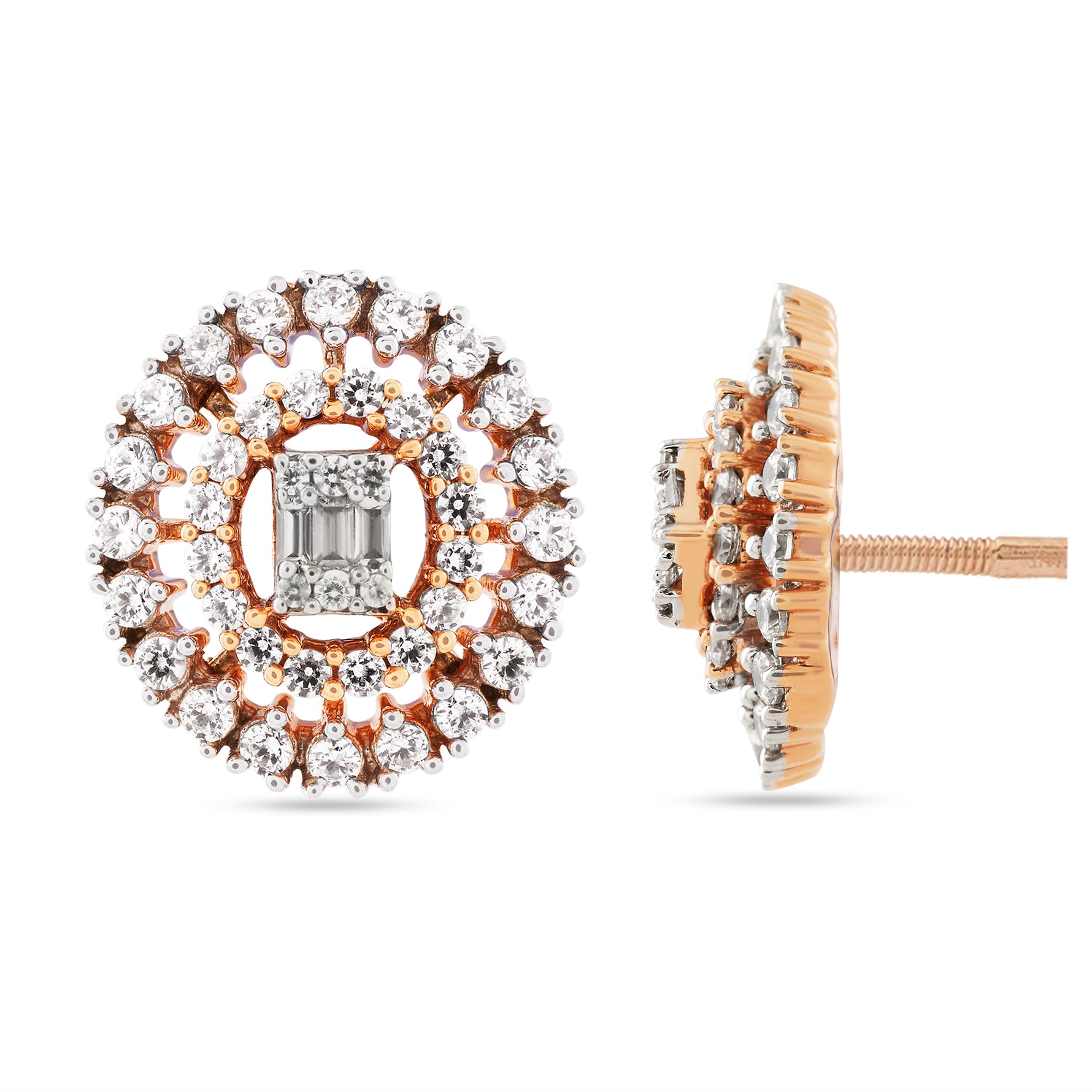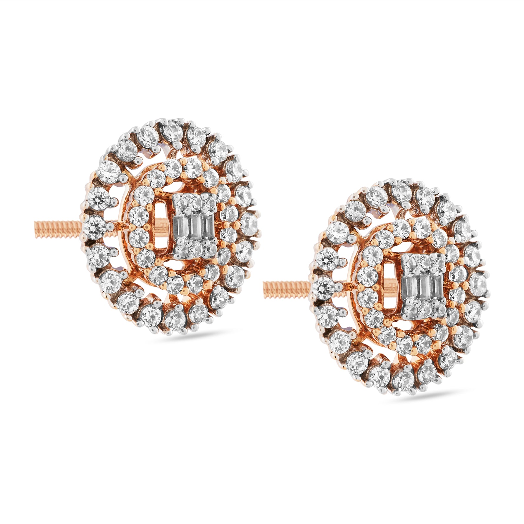 Capture the essence of timeless glamour with these stunning circular stud earrings. Each piece features a sophisticated baguette-cut center cluster, beautifully framed by a shimmering double halo of round brilliant accents. Perfect for elevating your evening attire or adding a touch of luxury to your professional office wardrobe.