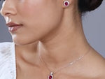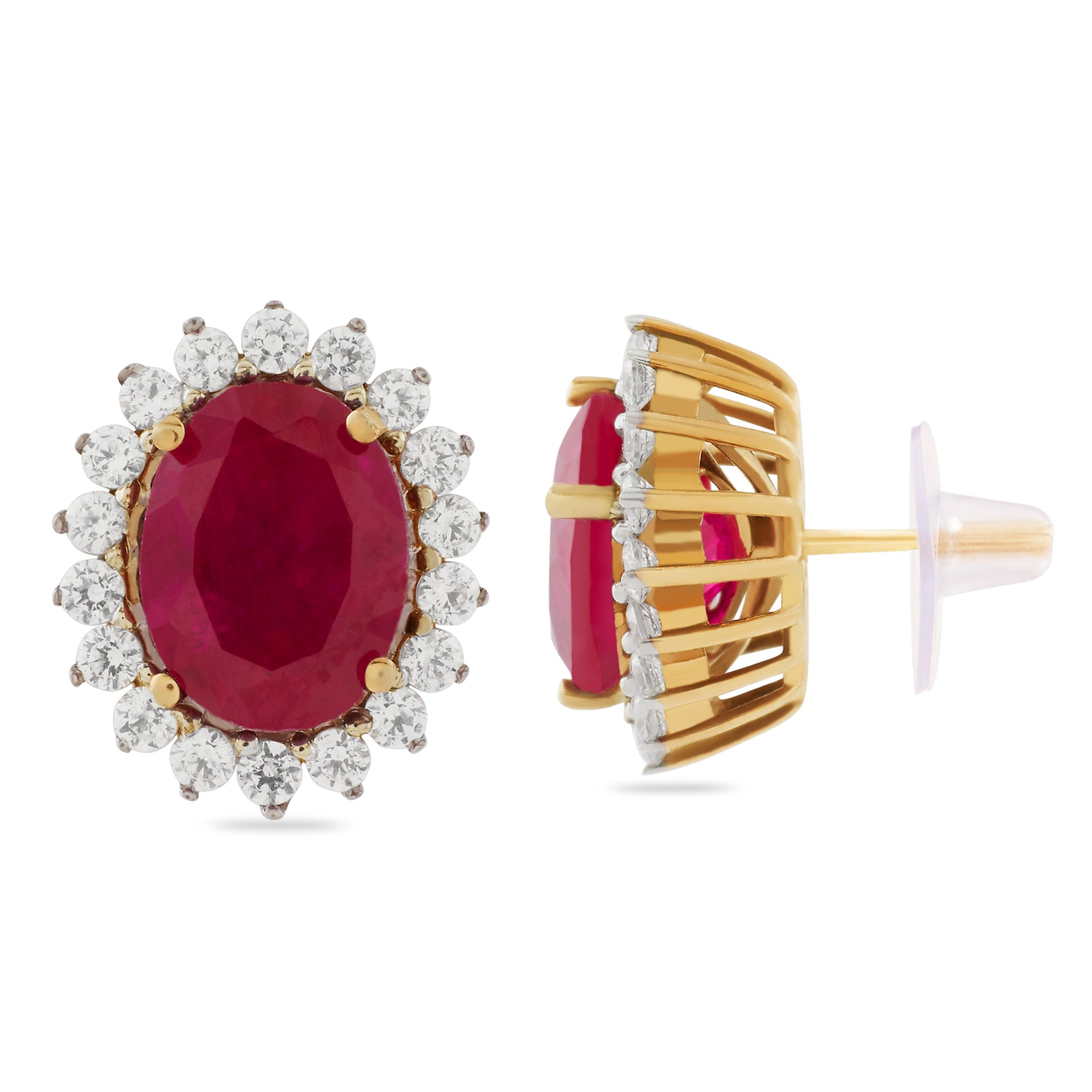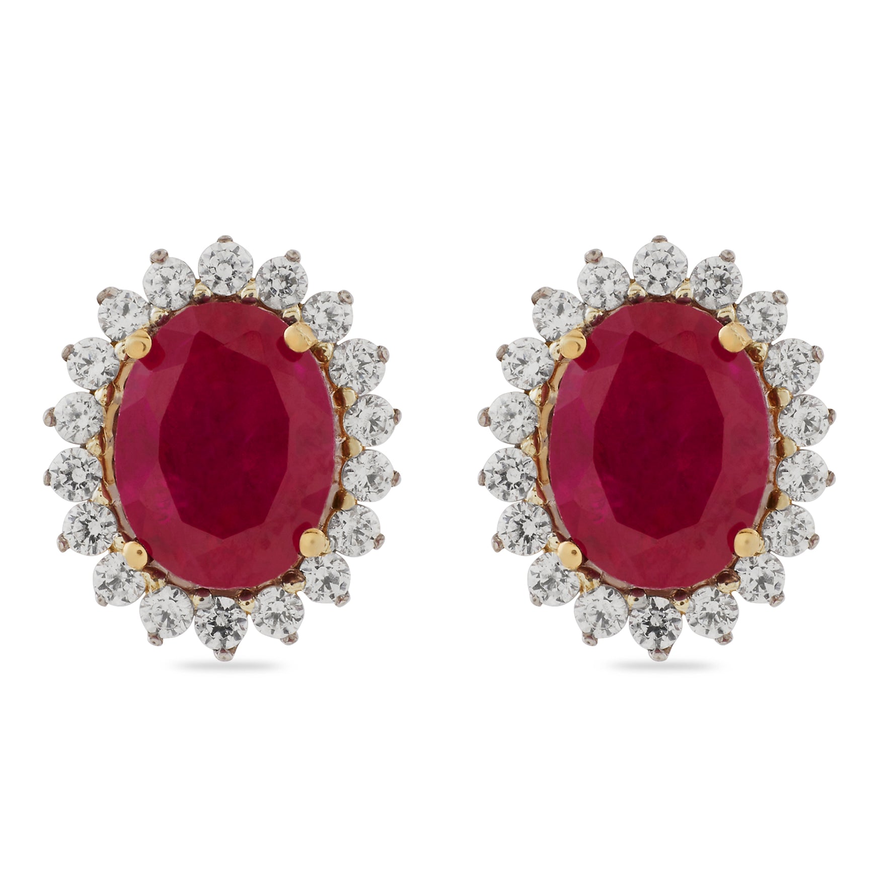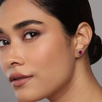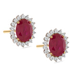 Capture timeless grace with these stunning stud earrings, featuring deep crimson oval-cut center stones. Each gem is meticulously embraced by a shimmering floral-inspired halo of brilliant accents, creating a look of regal sophistication. Perfect for adding a touch of vintage-inspired luxury to your evening ensemble or celebrating a special milestone.
