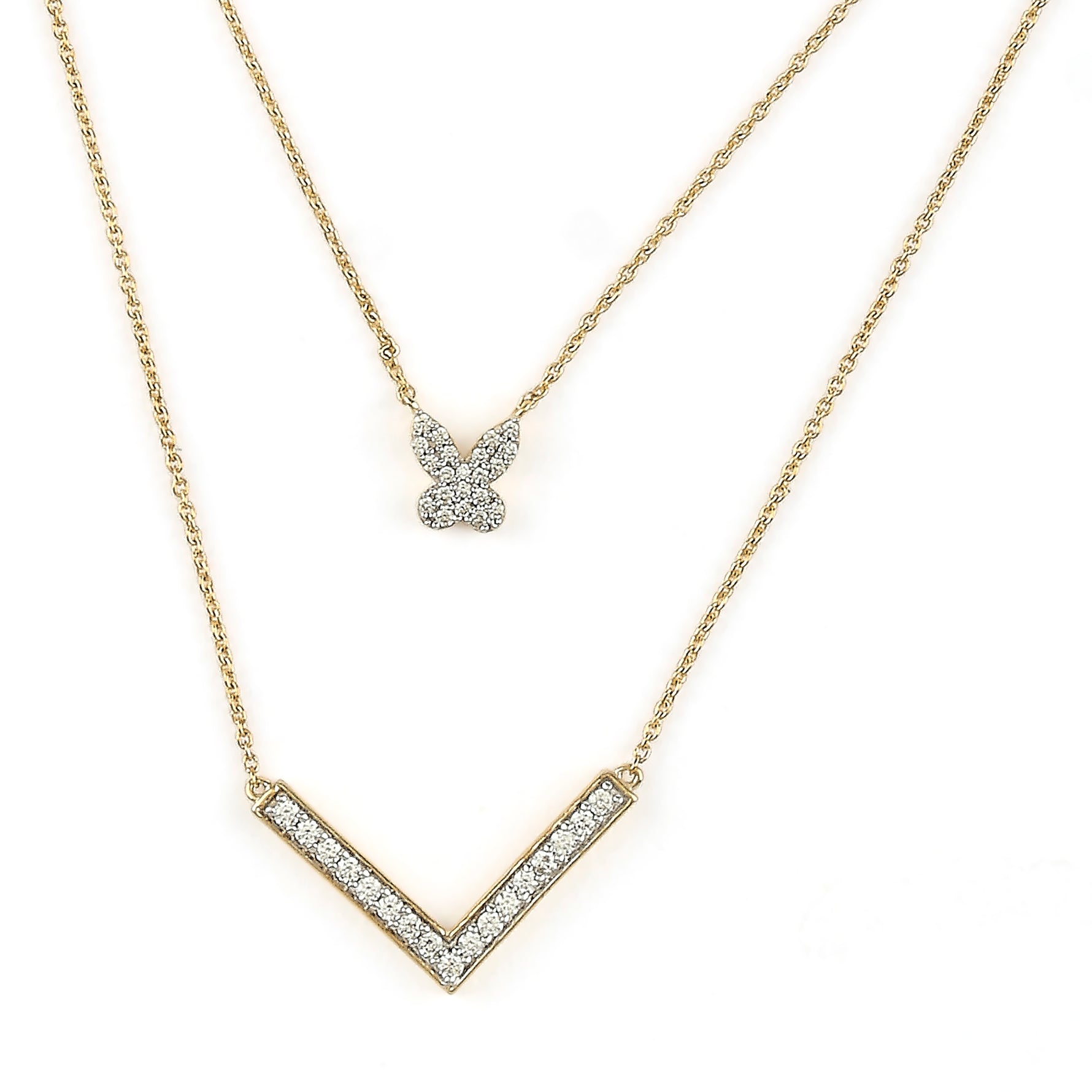 Embrace timeless charm with this exquisite double-layered necklace, featuring a delicate shimmering butterfly paired with a sleek, modern chevron drop. This graceful design offers a perfectly curated layered look in one piece, blending whimsical nature-inspired motifs with clean geometric lines for an elegant, sophisticated touch to any ensemble.