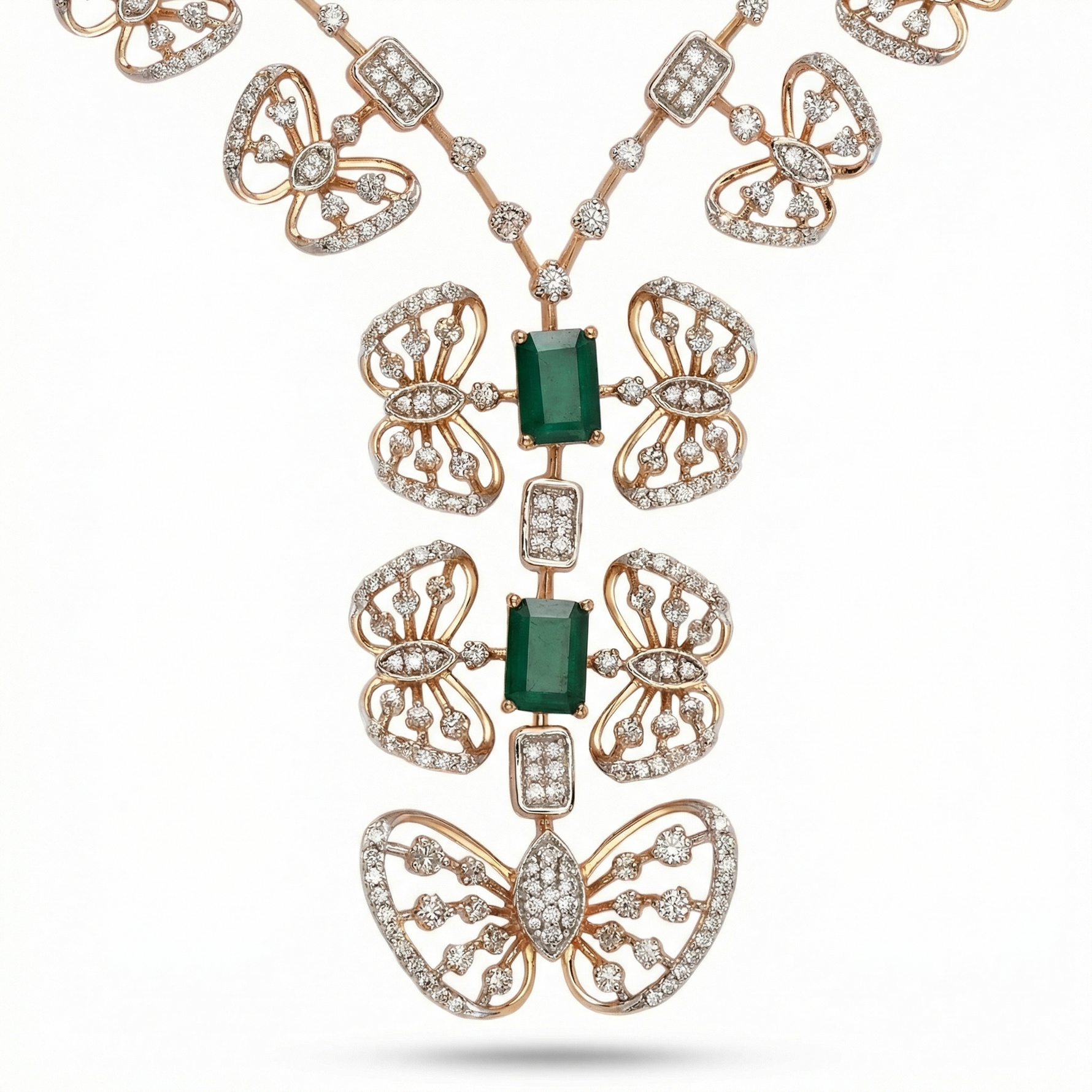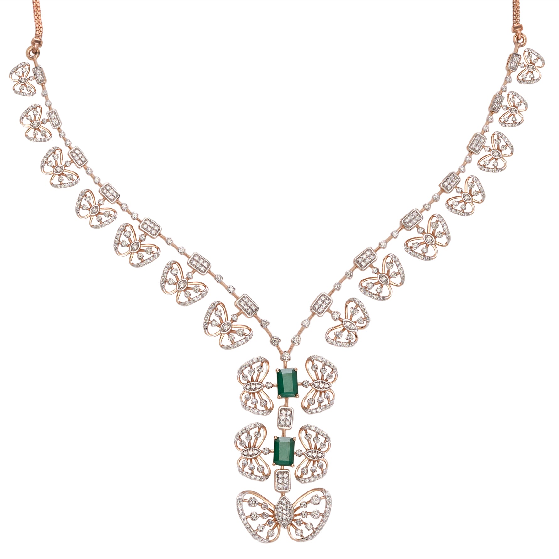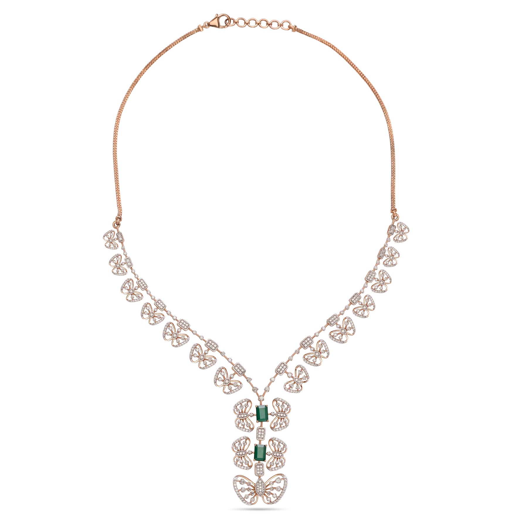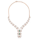 This elegant V-shaped necklace features dual floral motifs with intricate layered detailing, blending classic charm with modern sophistication. Perfect for weddings, receptions, or festive occasions, it adds a refined statement of grace and timeless beauty to any ensemble.