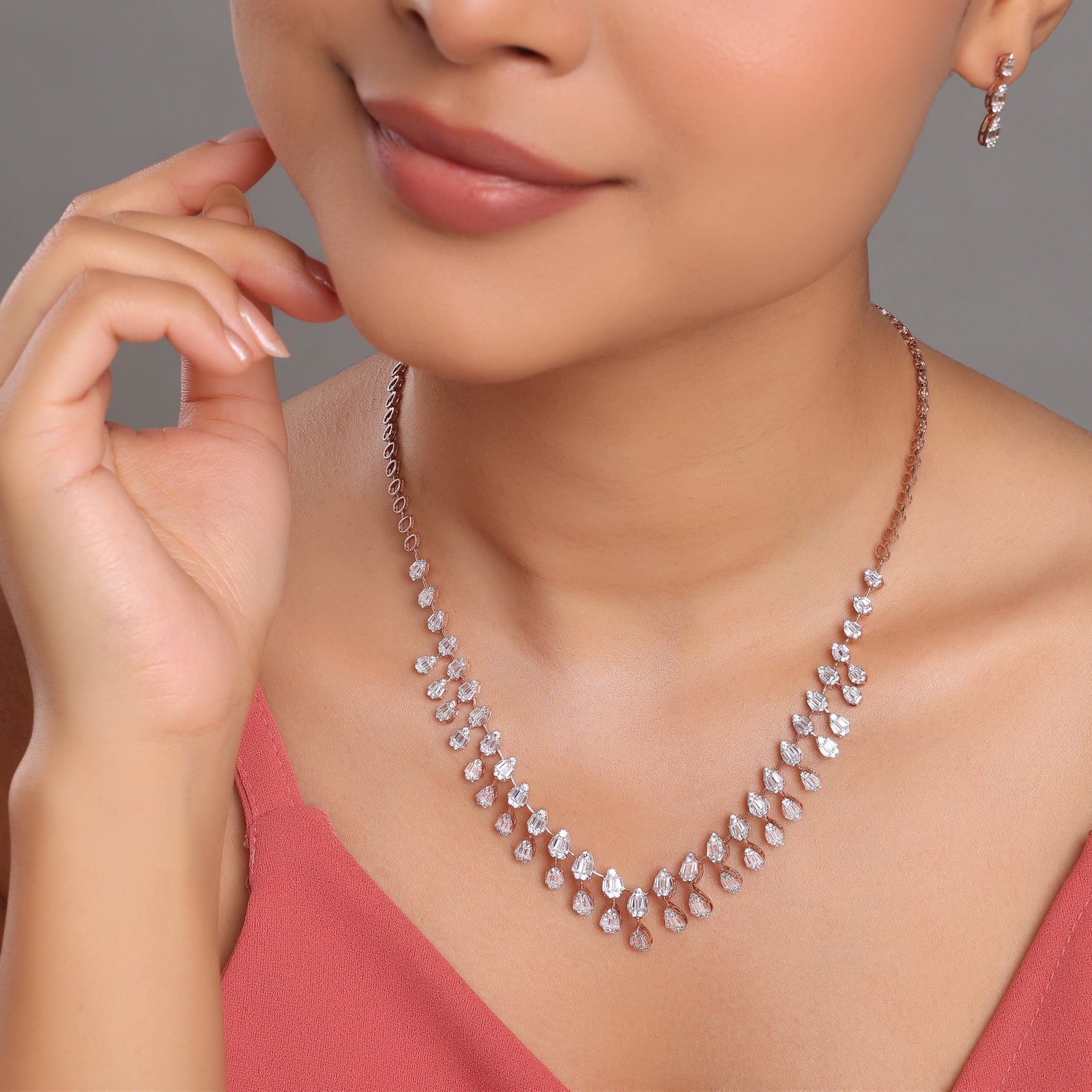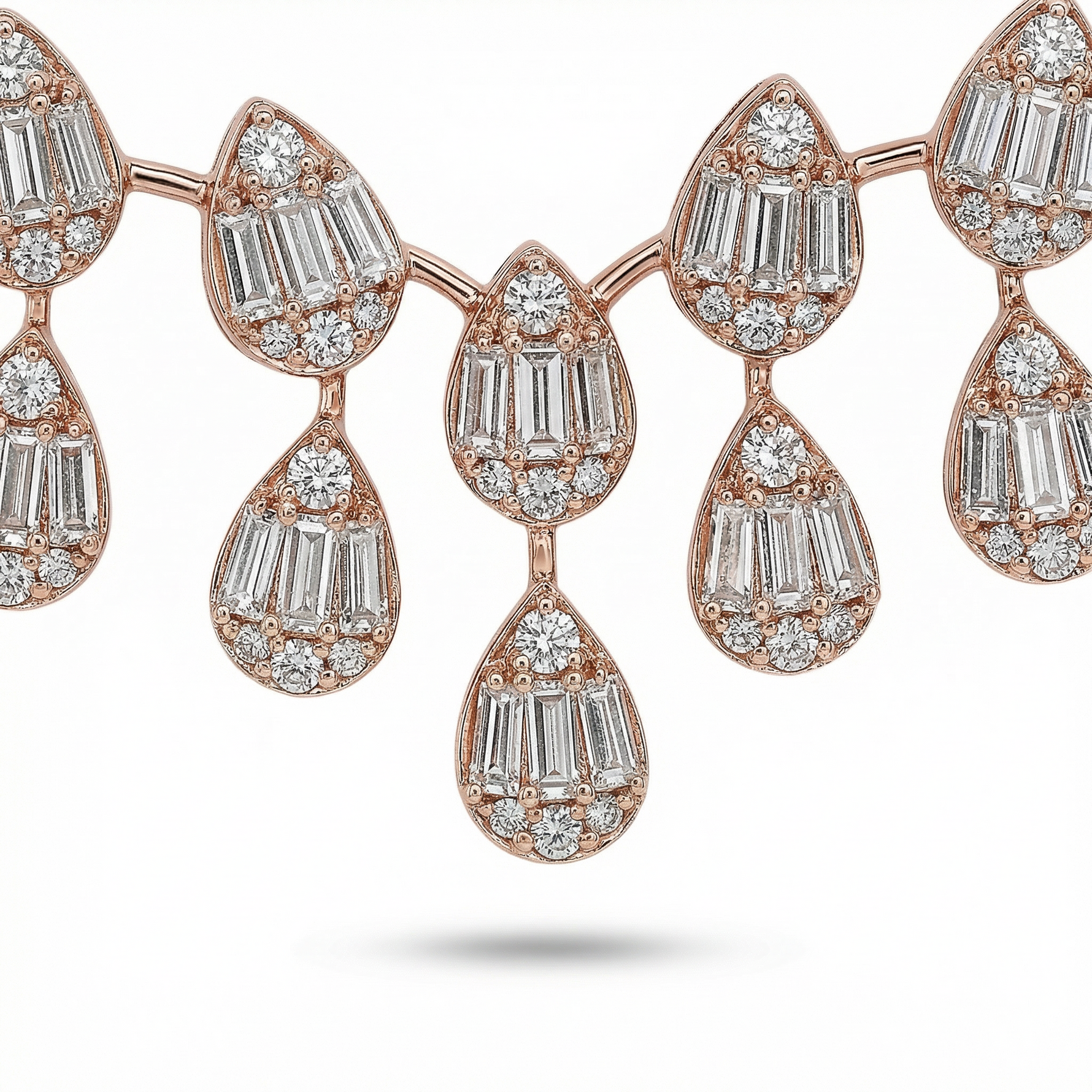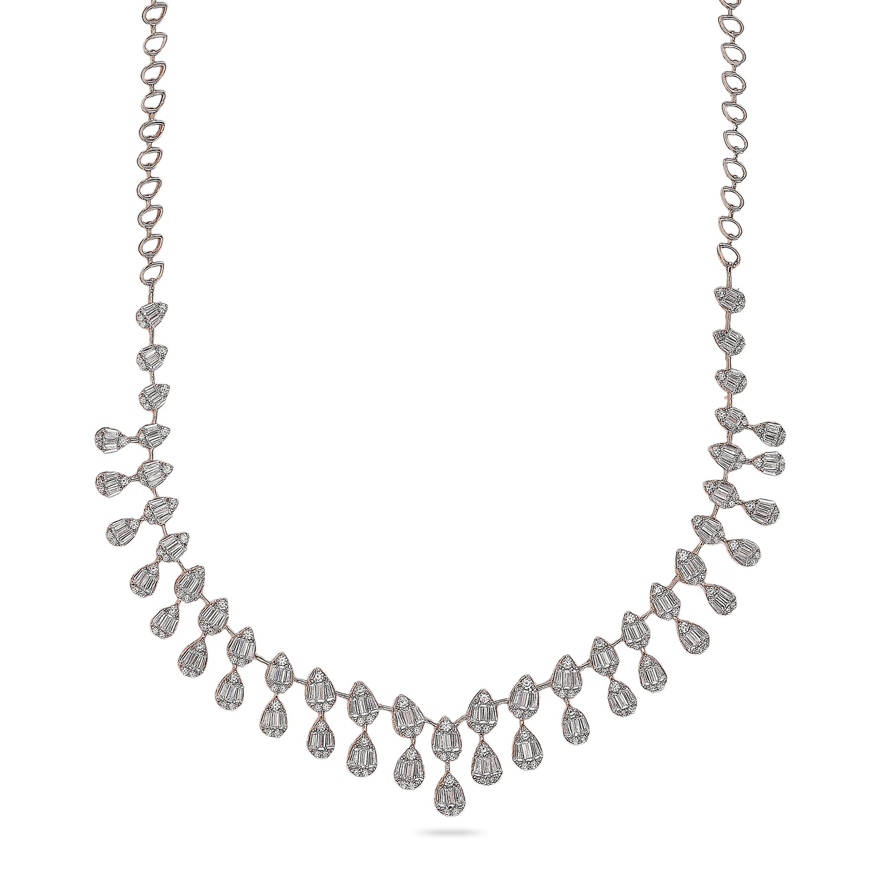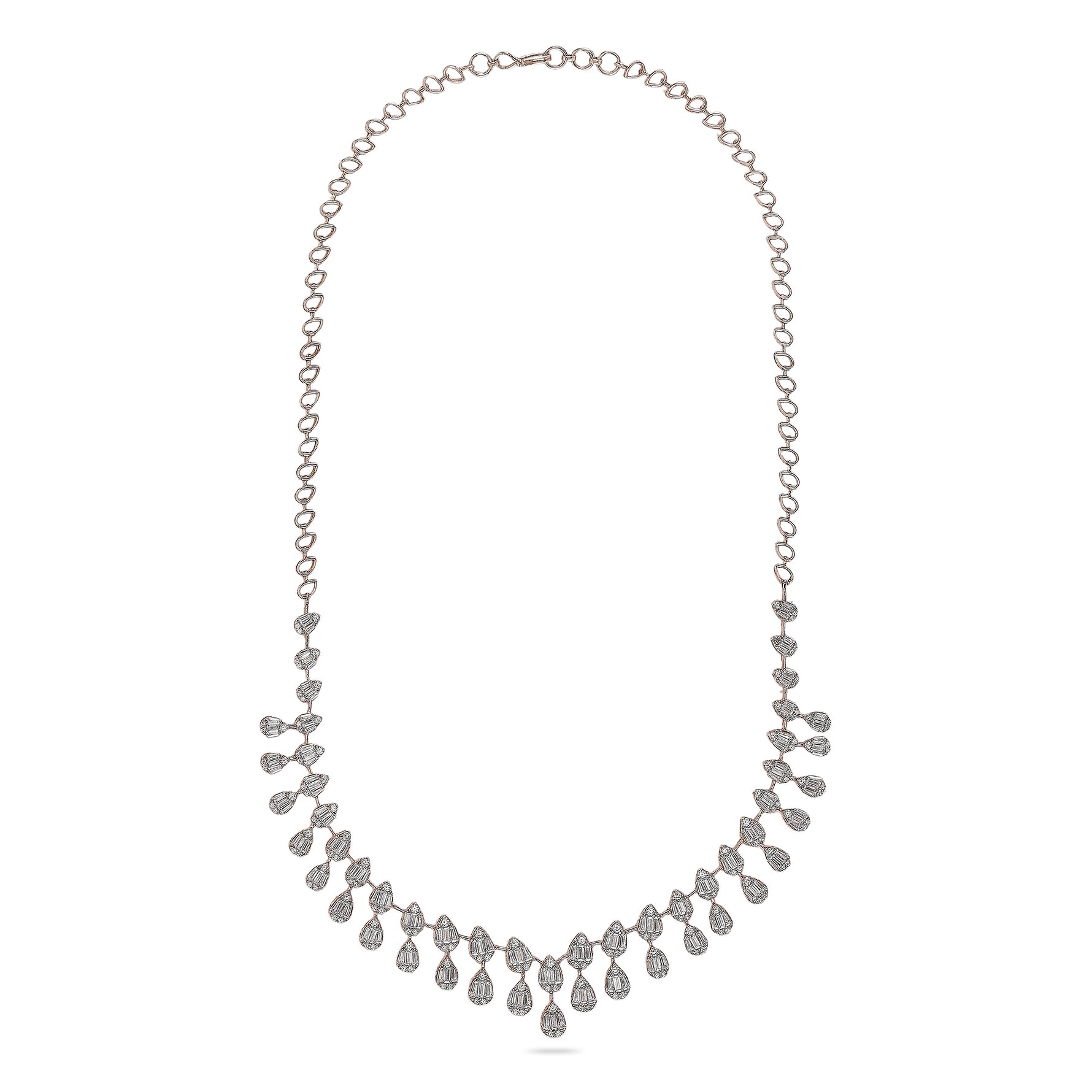 This elegant necklace features a cascading arrangement of pear-shaped drops that form a refined, symmetrical neckline. Designed to frame the neckline beautifully, it offers classic glamour with modern finesse, making it an ideal choice for weddings, evening celebrations, and meaningful gifting occasions.