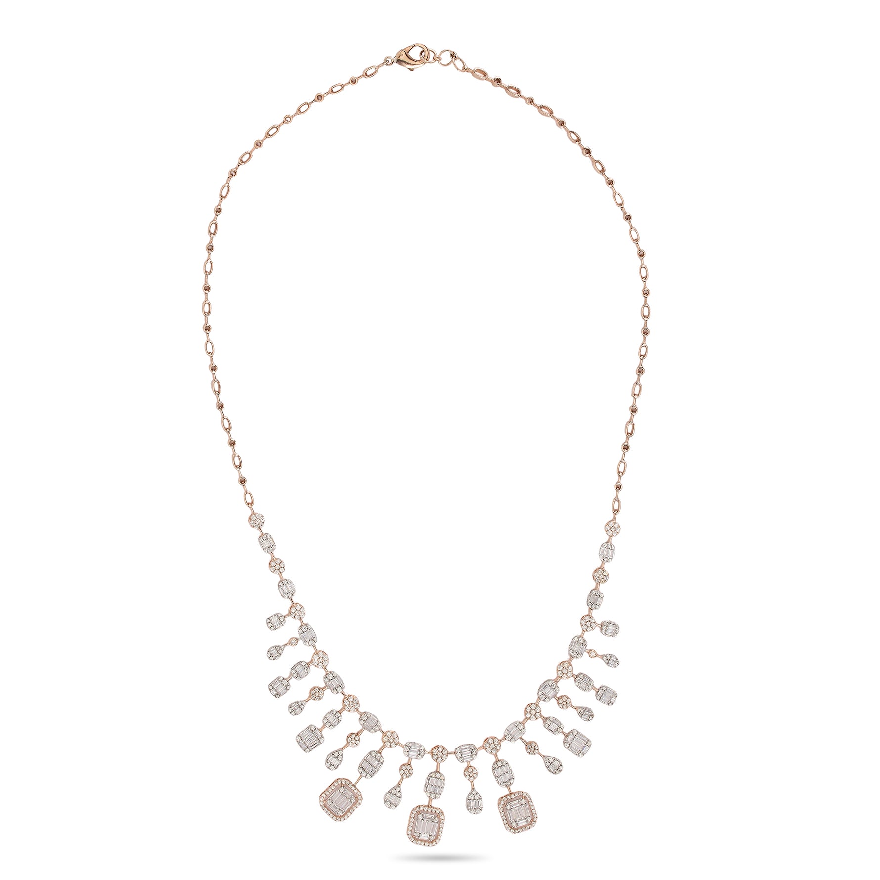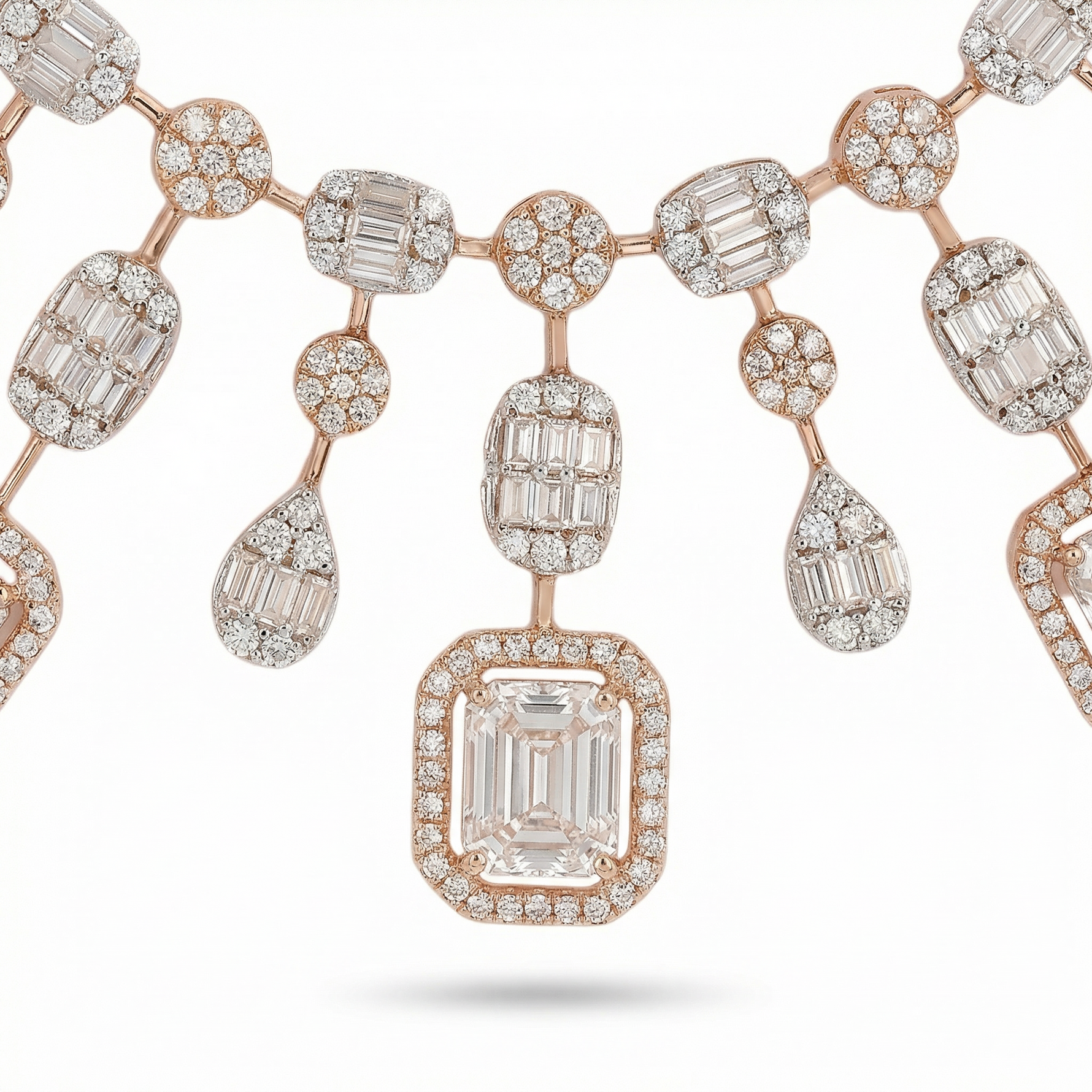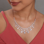 An elegant statement necklace featuring a structured row of geometric drops that create a graceful cascading effect. Designed to sit beautifully along the neckline, it blends classic symmetry with contemporary finesse. Perfect for celebrations and formal gatherings, this piece delivers understated drama and polished sophistication to any special-occasion look.